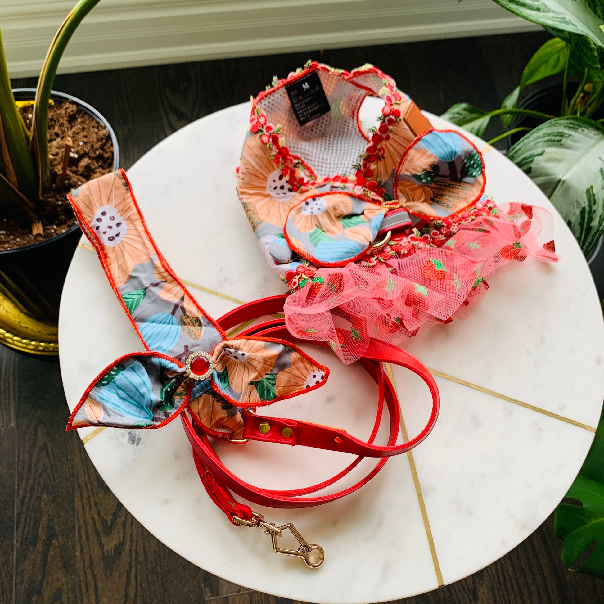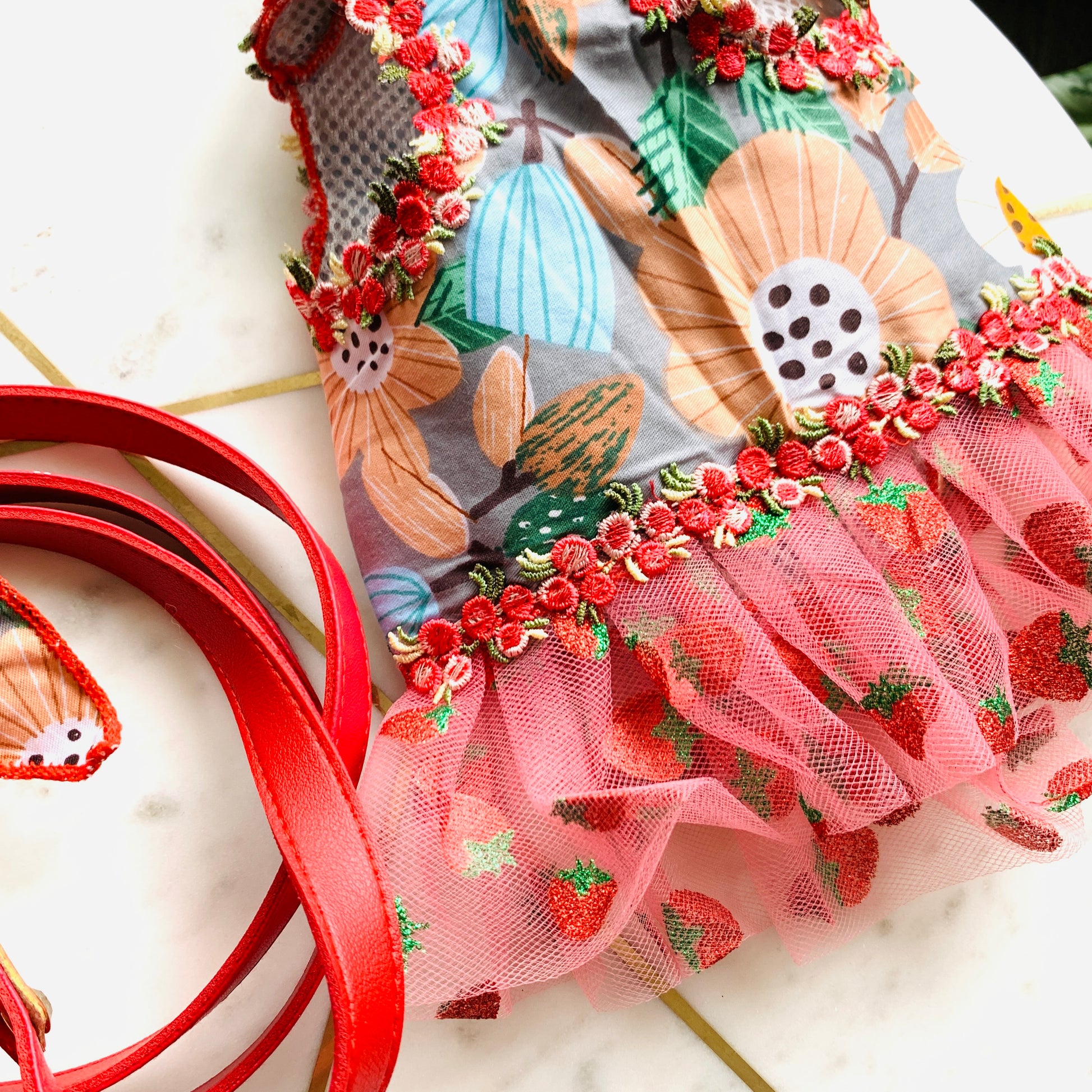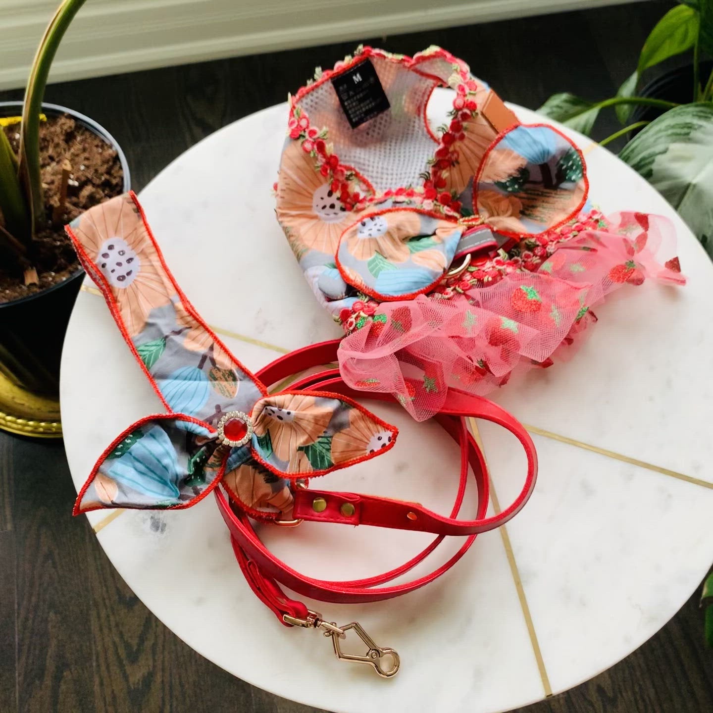 Strawberry Pom Fashion Harness Dress Set| For Elegant Puppy or Kitten