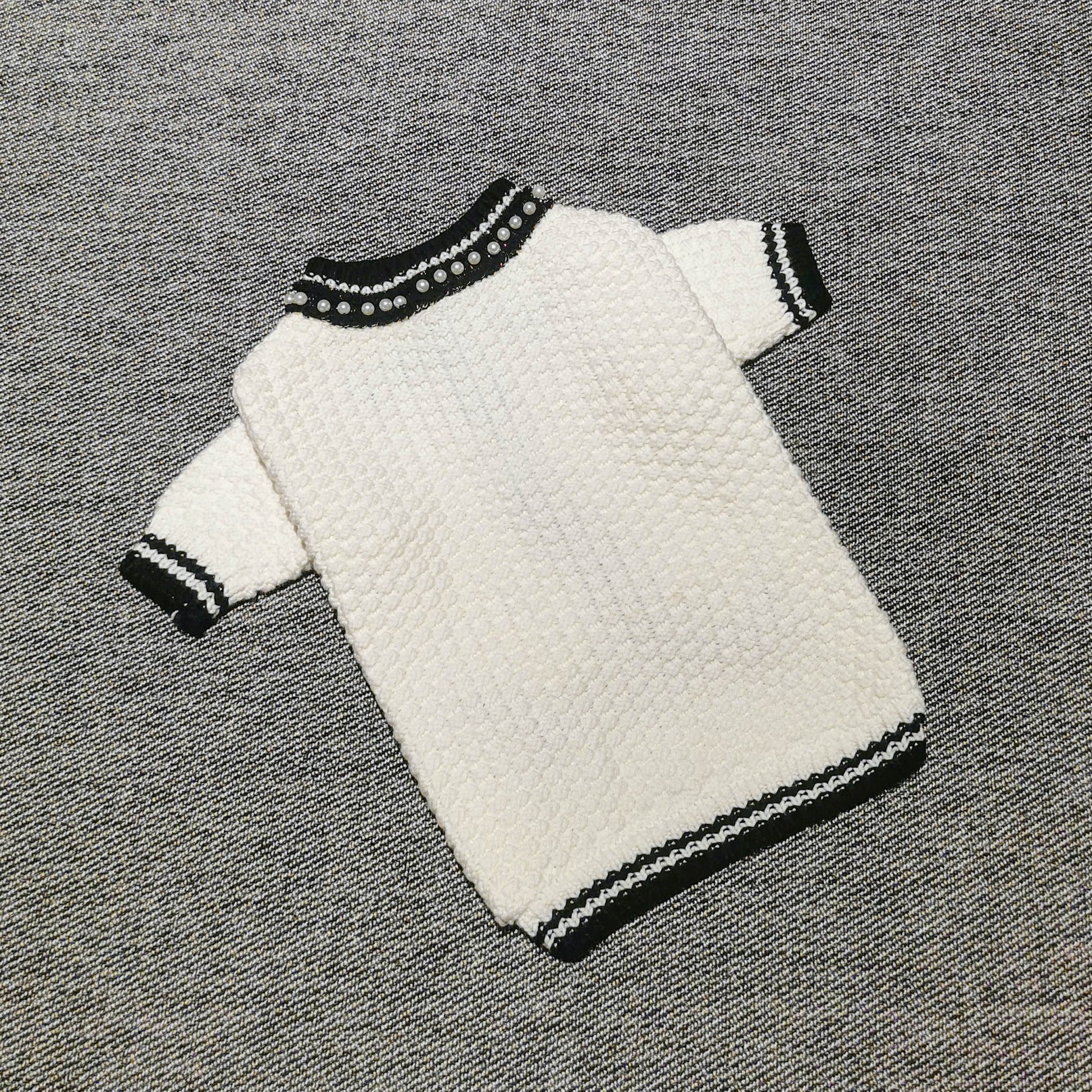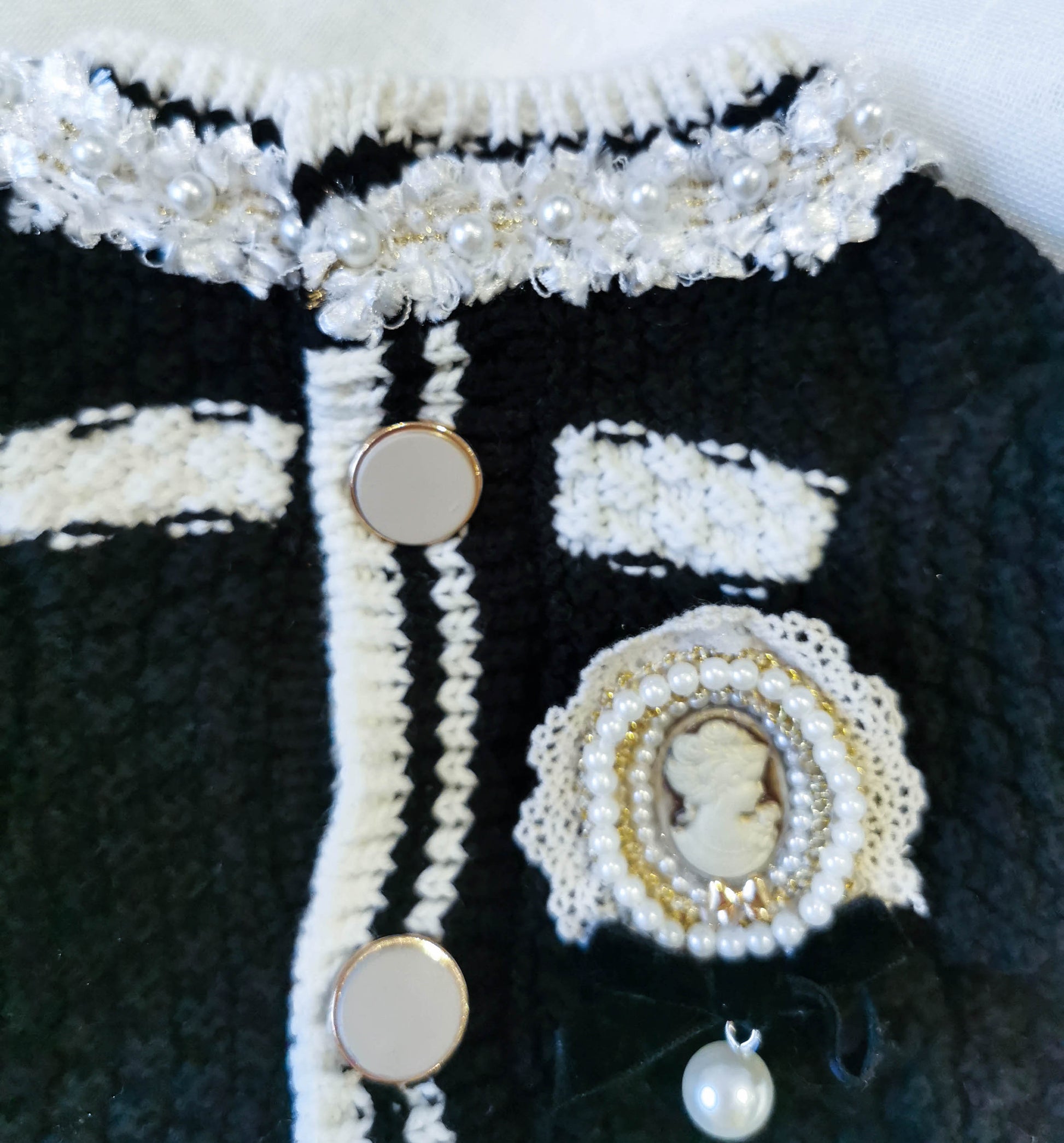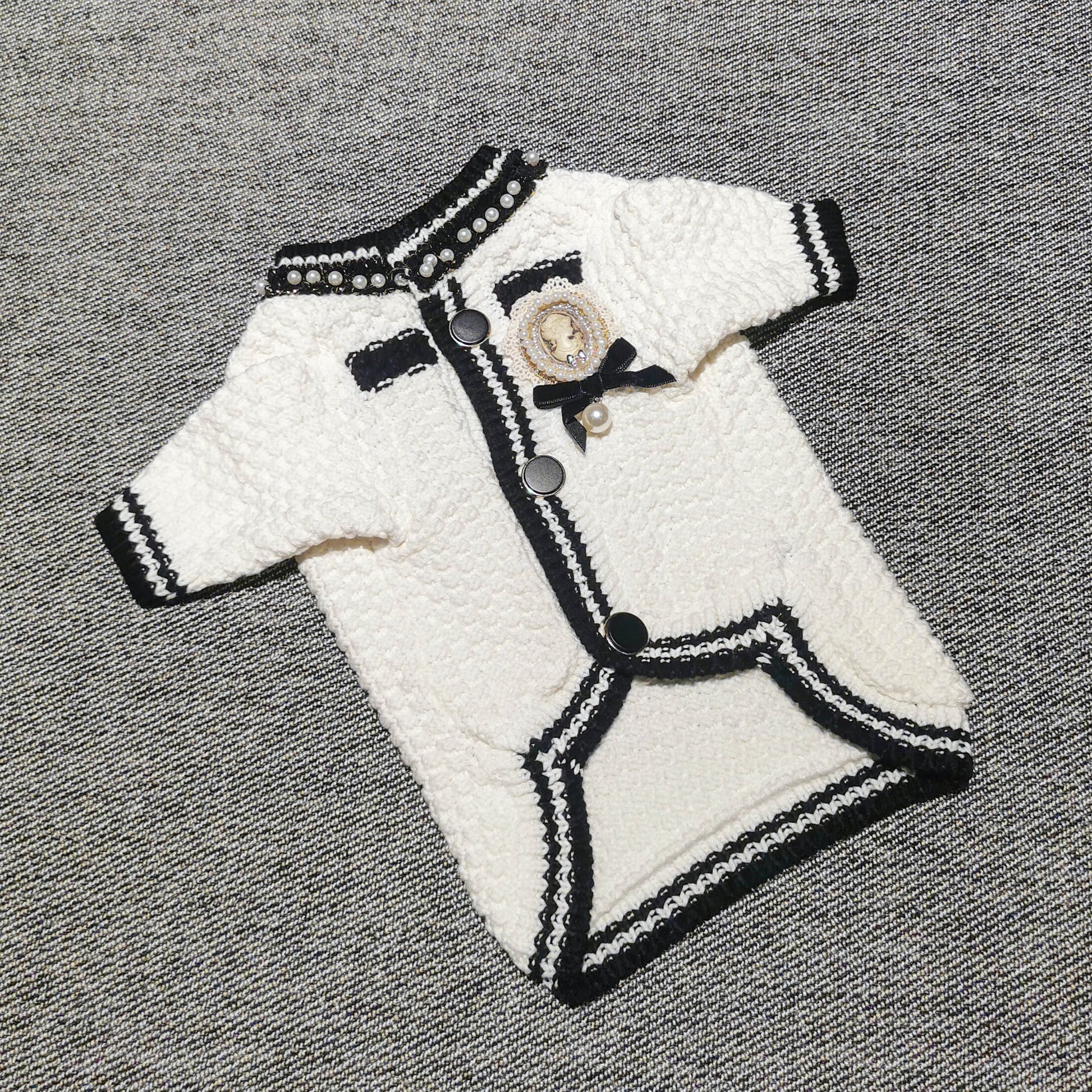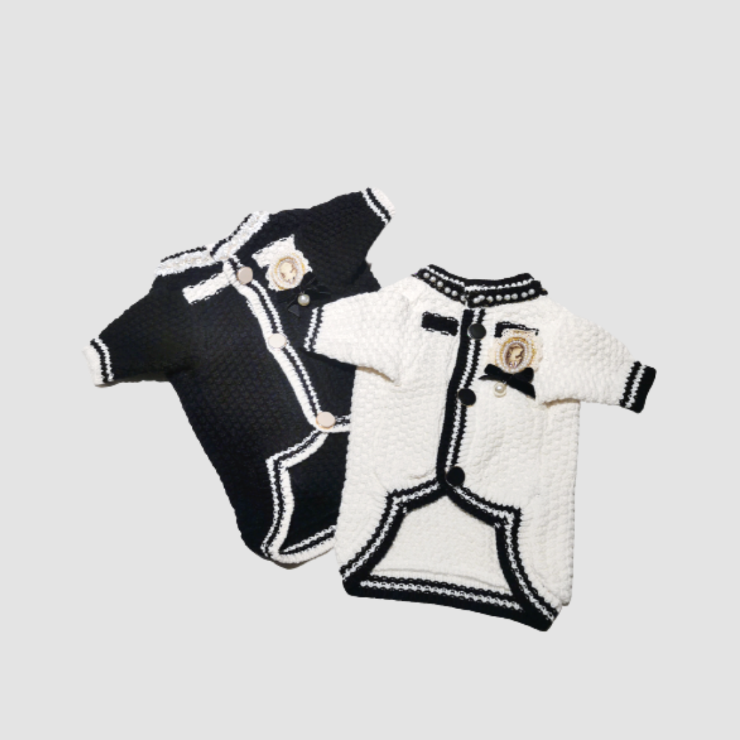 The Classic Style Monogram Sweater! Handmade with every detail possible. Pearl decorated collar, curved chest design, tailor knitted sleeves, dreamy vintage style laced brooch all made this sweater a special addition to your pet's closet.