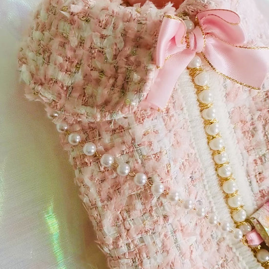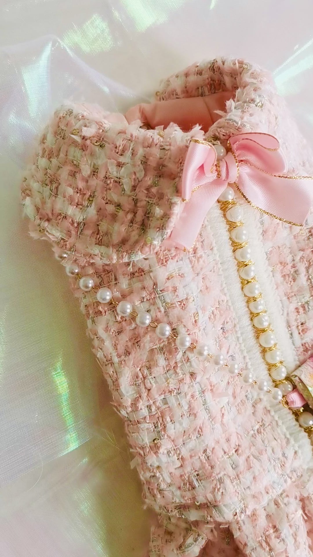š Introducing our hand-made chic pet sleeve-less dress in adorable tweed! The vest design ensures your pet is comfy and stylish, with a bonus removable cross-body bag for a feminine touch. Choose from fresh pink or classic golden black tweed.
